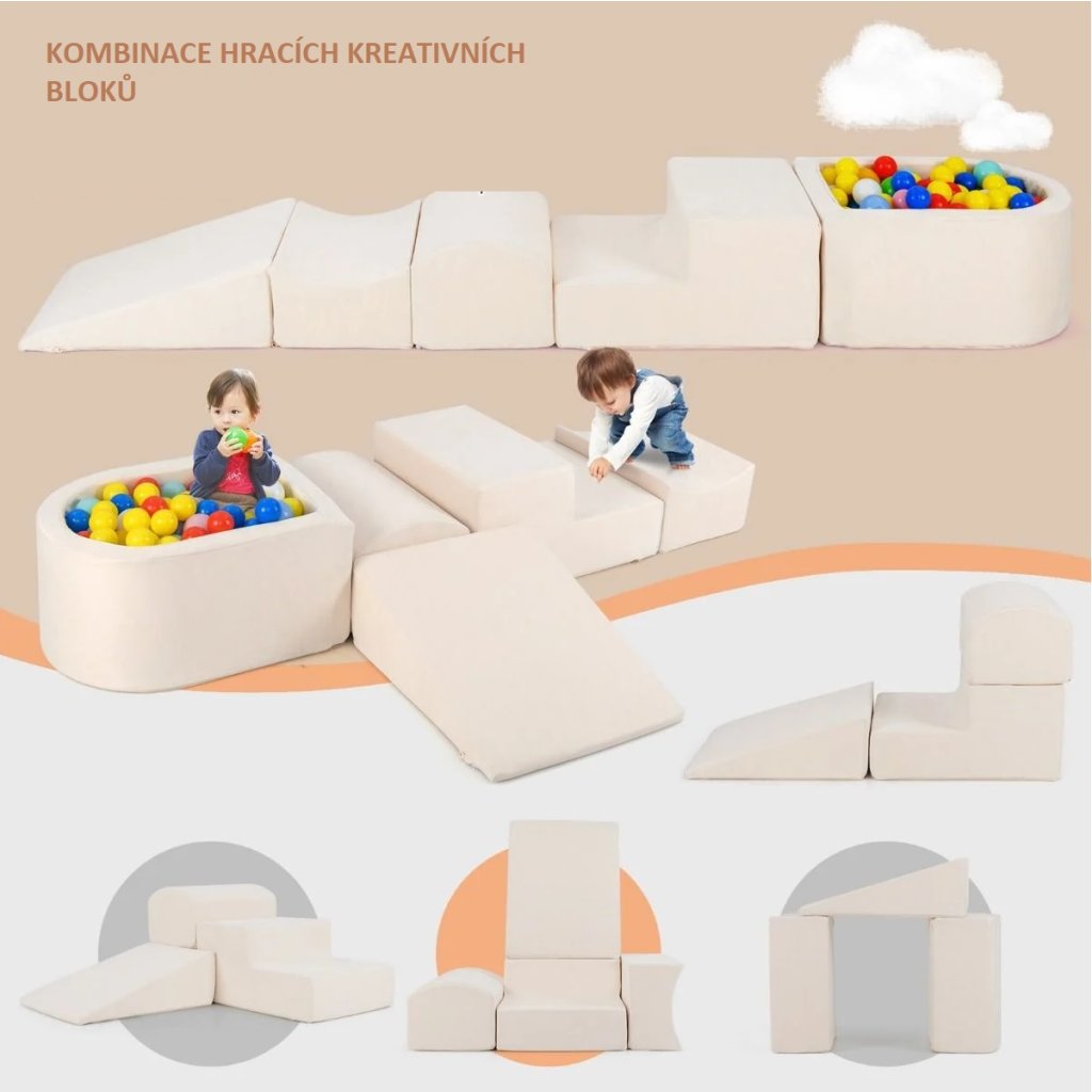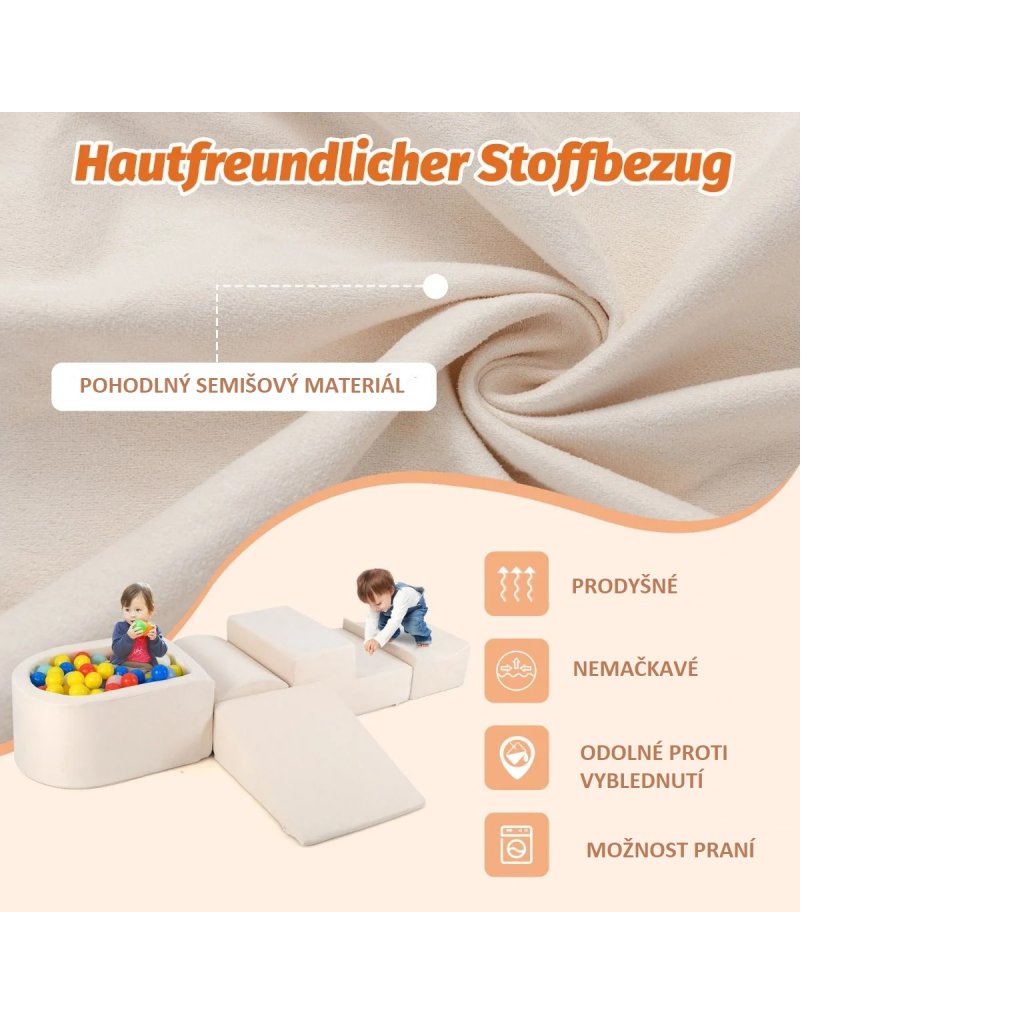 Hľadáte pohodlnú lezeckú hračku pre vaše deti? Naša 5dielna sada lezeckých blokov je ideálnou voľbou. Herná súprava sa skladá z 5 dielikov, ktoré môžu deti kombinovať a vytvárať tak rôzne tvary alebo štruktúry pre hodiny zábavy. Látkové poťahy šetrné k pokožke a mäkká huba vytvárajú bezpečné a pohodlné prostredie na hranie detí vo veku od 3 rokov. Snímateľné poťahy, ktoré je možné prať v práčke, sa tiež ľahko čistia. A čo je najdôležitejšie, produkt nemá žiadne ostré hrany ani tuhú štruktúru, čo zvyšuje bezpečnosť. Parametre: Farba: béžová Materiál: Semiš, huba Rozmery bazéna s loptičkami: 61 x 46 x 30 cm (D x Š x V) Rozmery šmykľavky: 57,5 ??x 46 x 20 cm (D x Š x V) Rozmery schodov: 59,5 x 46,5 x 29 cm (D x Š x V) Rozmery polkruhov: 46 x 30 x 24 cm (D x Š x V) Rozmery obdĺžnik: 46 x 30 x 18,5 cm (D x Š x V) Vhodný vek: Od 3 rokov Celková hmotnosť: 7kg Obsah dodávky: 1 x 5-dielna sada penových blokov 1 x manuálDodatočné parametre