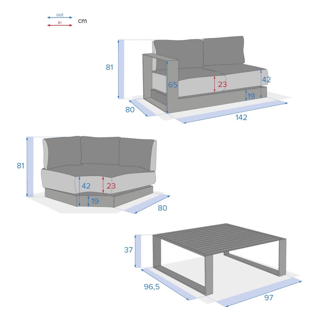 Vkusná a ojedinelá kombinácia záhradného nábytku - konferenčný stolík, rohová sedačka pre 5 osôb s komfotnými sedacími vankúšmi. Tento záhradný nábytok, zložený z päťmiestnej rohovej pohovky a štvorcového konferenčného stolíka, vás určite osloví svojimi modernými líniami v biela prevedení. Sedacie vankúše a opierky sú vďaka hrúbke veľmi pohodlné a dostatočne veľké pre maximálny odpočinok a relaxáciu. Vankúše sú maximálne pohodlné, sú vodoodpudivé, očistíte iba vlhkou handričkou. Hliníková konštrukcia s epoxidovou úpravou je odolná voči hrdzi a UV žiareniu. Ľahko sa čistí a je možné ho čistiť iba mydlovou vodou. Odporúčame záhradný nábytok na zimu uložiť na chránené a suché miesto. Rozmer stolíka: 97 x 97 x výška 36 cm Rozmer bočných lavíc: 142 x 80 x výška 65 cm Rozmer rohovej lavice: 158 x 102 x výška 65 cm Výška sedacej časti bez vankúšov: 22 cm Rozmer vankúšov: 58 x 38 cm Nosnosť: 110 kg Farba: biela Materiál sedákov: polyester Materiál konštrukcie: hliník hmotnosť 85,5 kg jednoduchá údržba - stačí iba utrieť vlhkou handričkouDodatočné parametre
